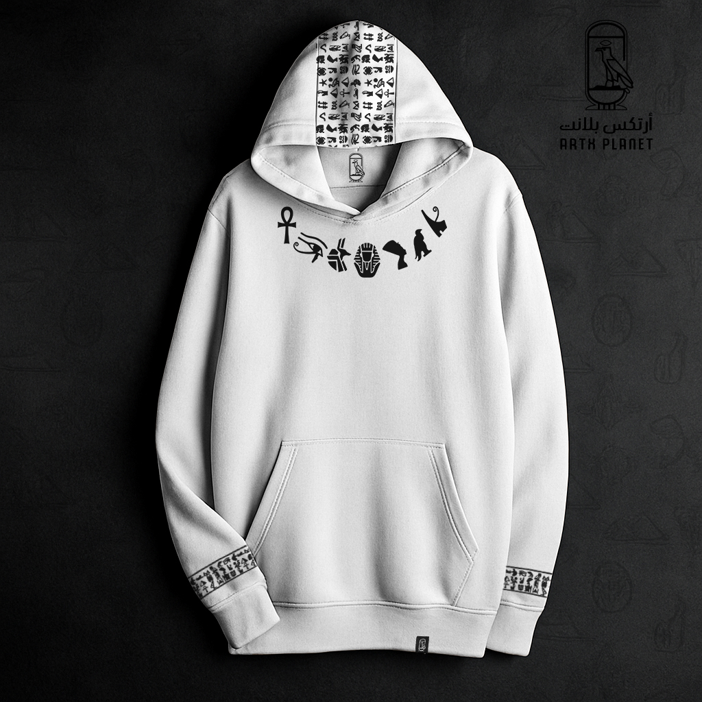 An Egyptian – Melton cotton Hoodie – printed by “Egyptian symbols and kings” ,, in a semicircular shape around the neck